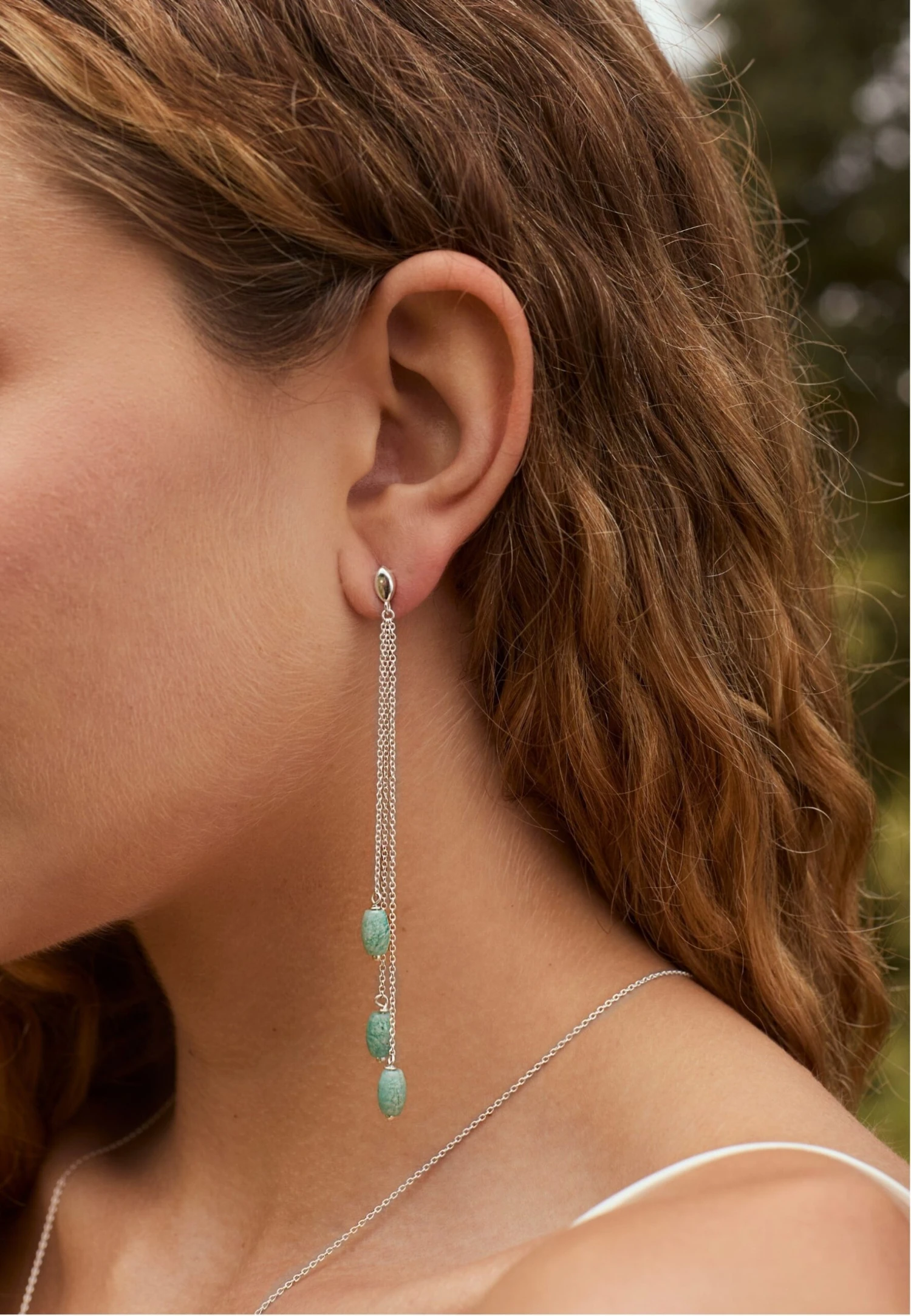 Están hechos de plata de ley 925 y tienen un diseño realmente encantador. Tres finas cadenas que caen en diferentes niveles, cada una con su propia piedrecilla de Amazonita al final. Es como llevar un pedacito de naturaleza contigo.