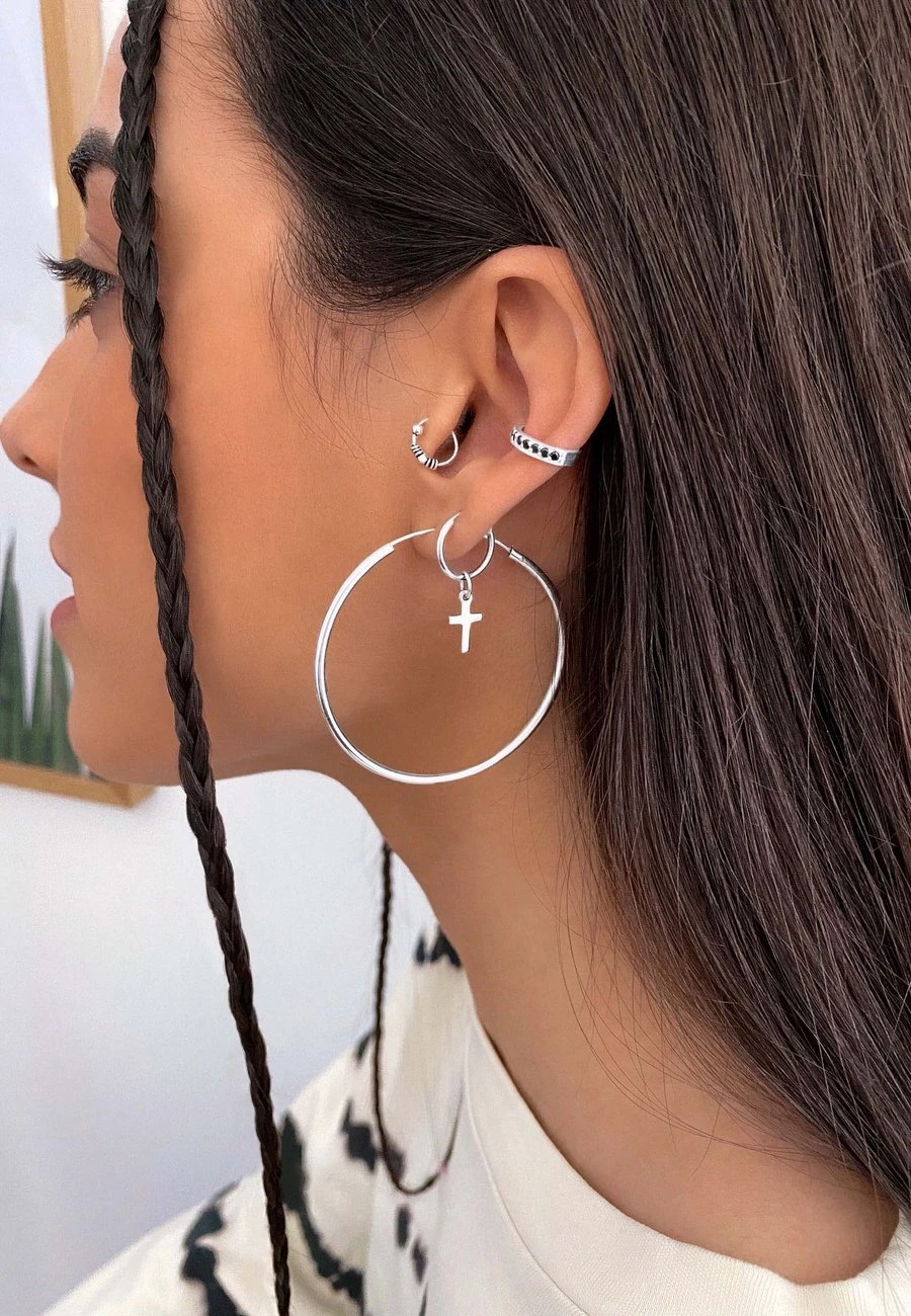 Los JIVANA son pendientes totalmente lisos y de Plata de Ley 925. Son perfectos para utilizarlos en el primer agujero de la orejita debido a su tamaño. Los puedes combinar muy bien con otros aritos y pendientes.