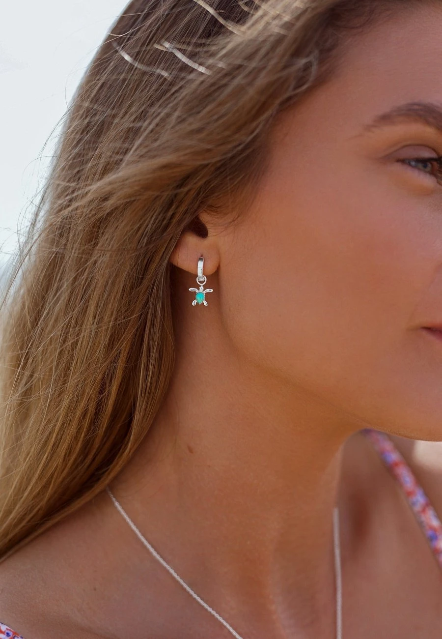 Están formados por unos aros de 10 milímetros de los que cuelga una tortuga. El cuerpo de la tortuga es una pequeña piedra turquesa, que aporta un toque de color a la joya. ¡Los pendientes KACHHUA darán mucha vida a tus looks!