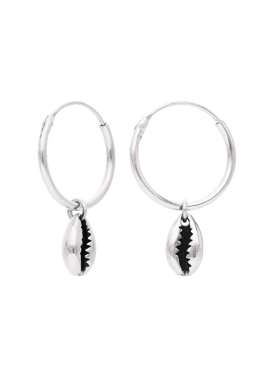 Los pendientes KARUN son aritos finos de 14 mm de diámetro de Plata De Ley 925. Tienen un colgantito en forma de caracola unido a la pieza principal.