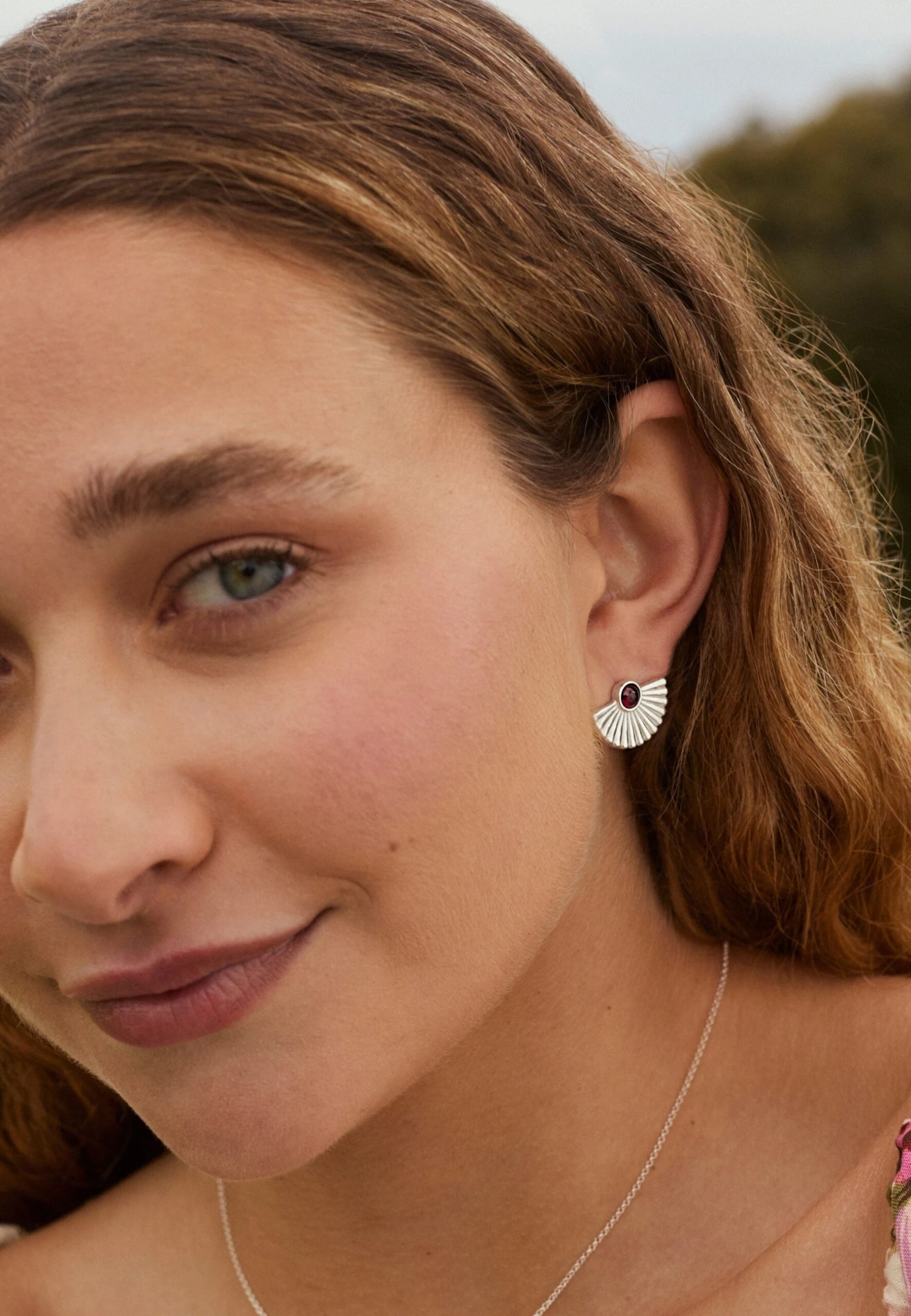 Los pendientes Rama de plata de ley 925, unos pendientes de botones transformados en exquisitas flores. Cada detalle está cuidadosamente trabajado para crear una pieza que captura la esencia de la estación primaveral, en el centro de estas flores se encuentra una piedra redonda natural granate.