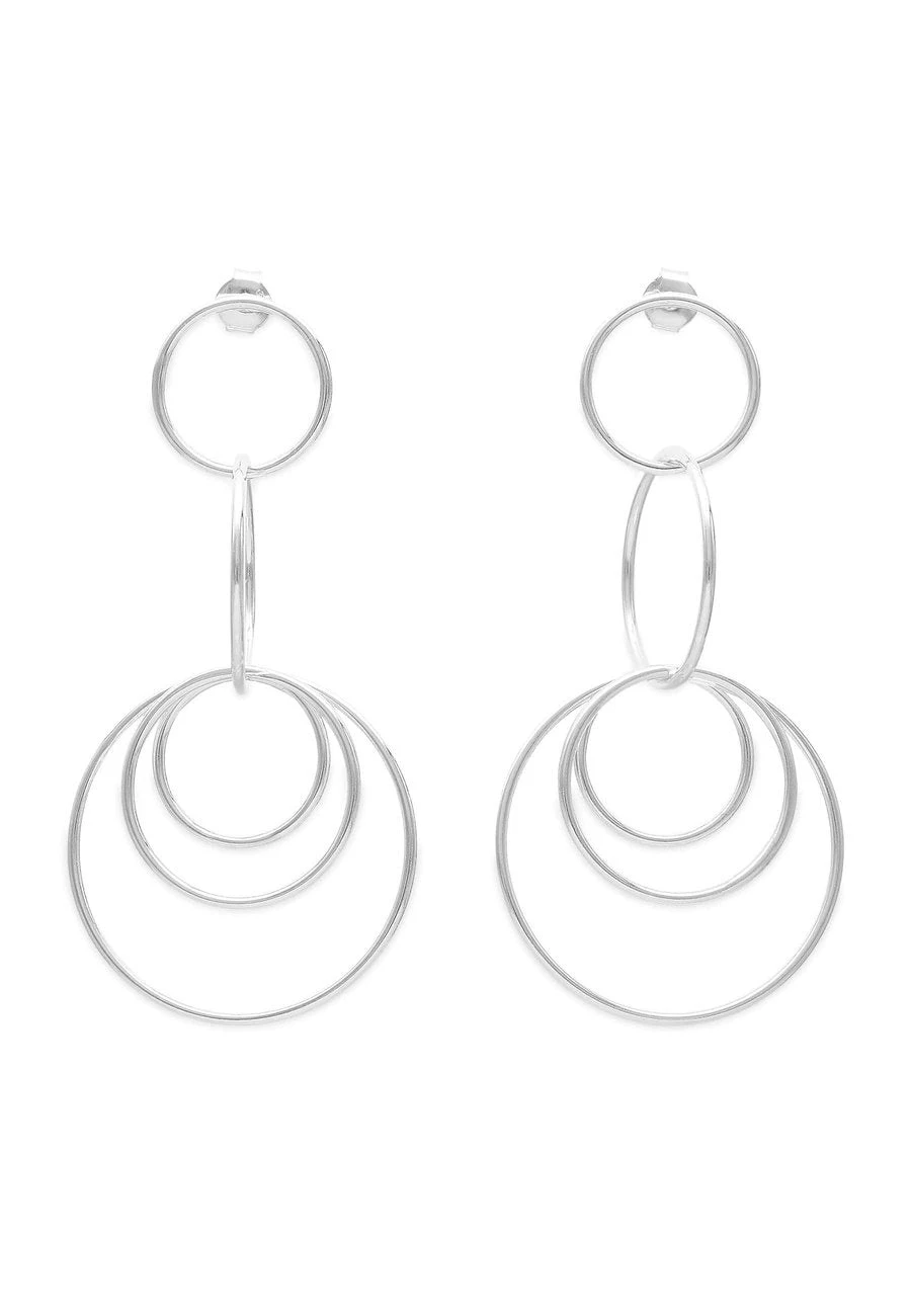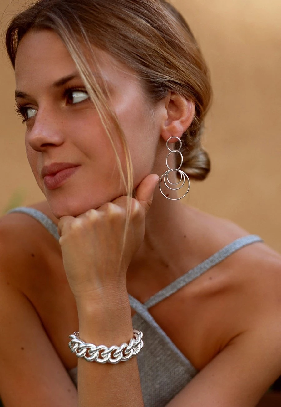 No te pierdas los nuevos pendientes Sai, hechos de plata de ley 925. Estos pendientes están formados por dos aritos intercalados con tamaños ascendientes, y en este último le cuelgan 3 aritos de distintos tamaños.
