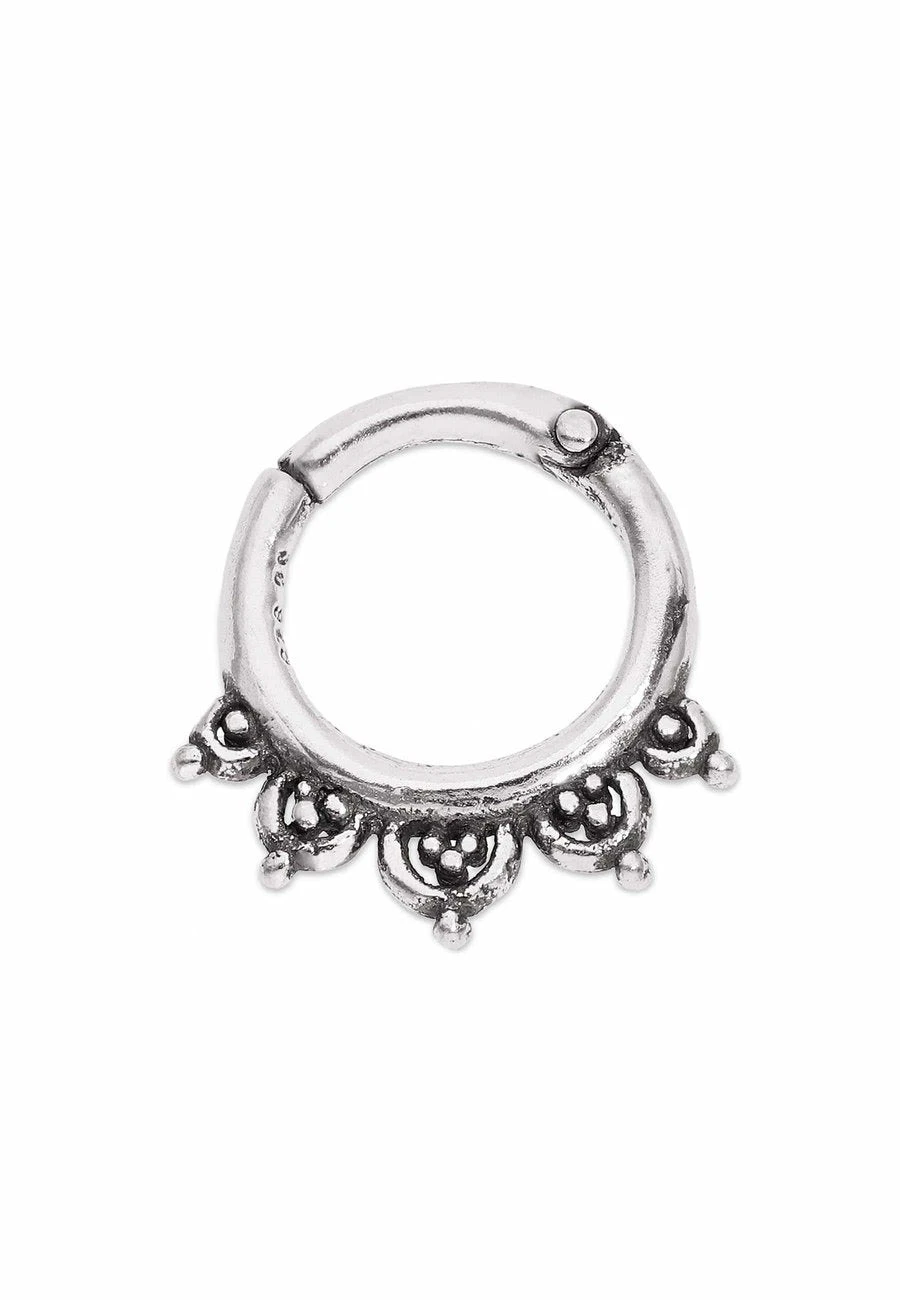 El ABHAY está formado por un arito grueso con un diseño de media flor de mandala y acabado envejecido. Es un piercing muy fácil de combinar y perfecto para los agujeritos del lóbulo, hélix y contrahélix.