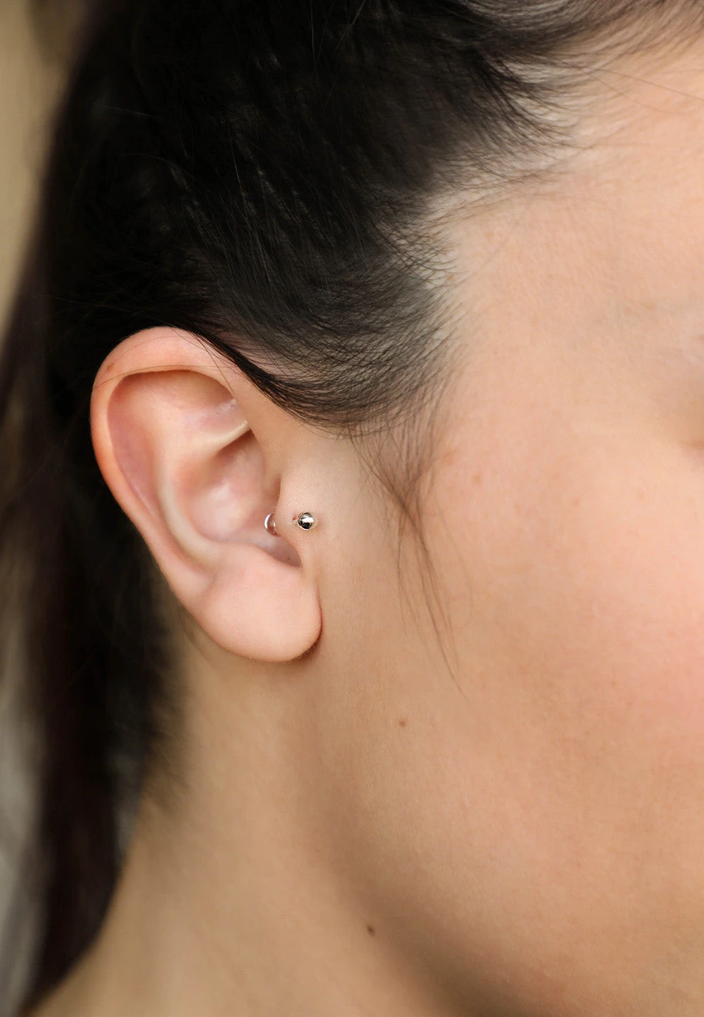La bola fina y elegante que adorna este piercing es un detalle encantador. Su tamaño discreto y su forma clásica son perfectos para el tragus, añadiendo un toque de brillo sin ser abrumador. El oro blanco de 9k brilla con un tono plateado y luminoso, creando un contraste elegante con tu piel y resaltando la belleza natural de tu oreja.