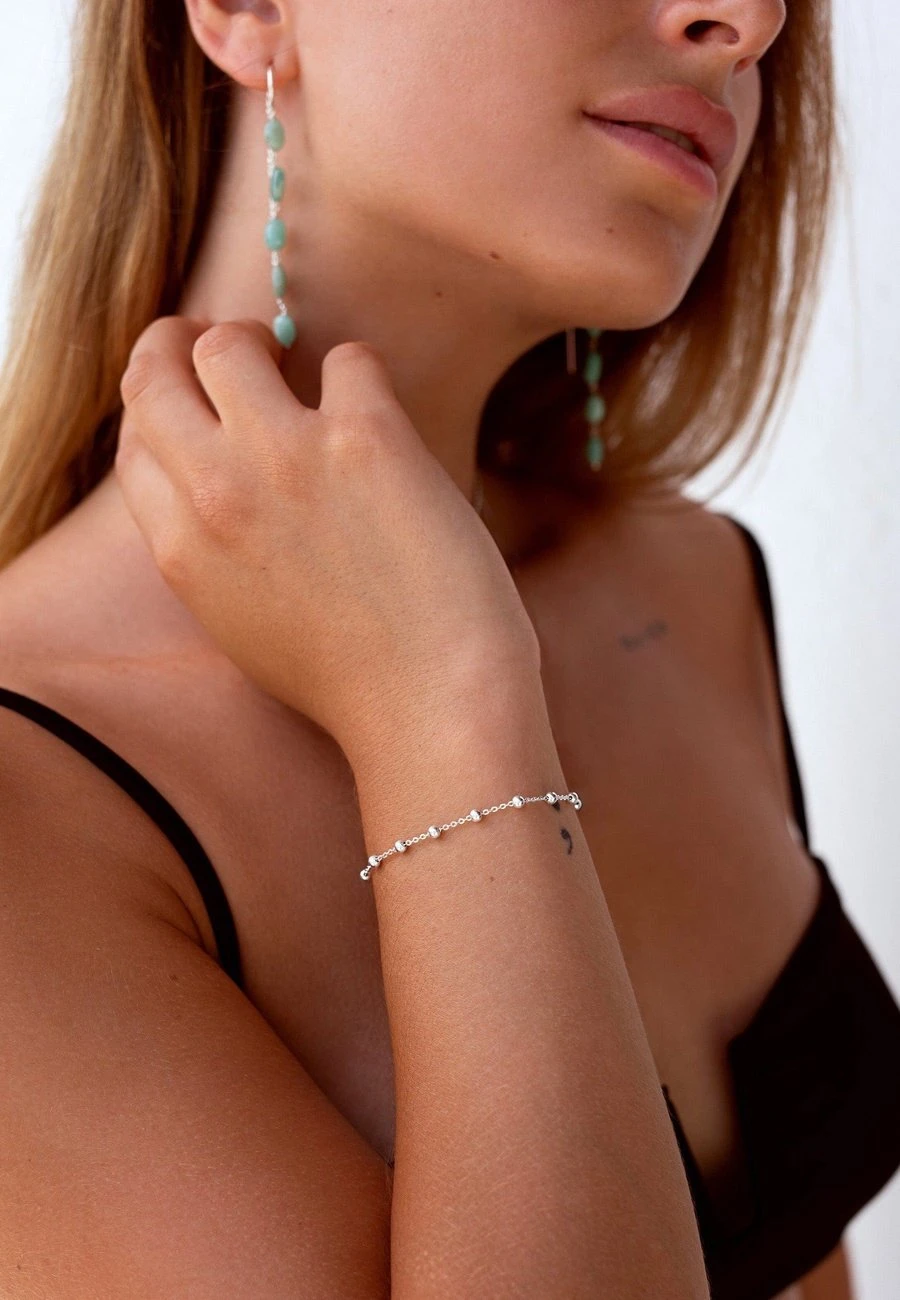 El modelito de pulsera ELESH está hecho en su totalidad con Plata de Ley 925. Es una pulsera muy original formada por bolitas de plata, que le dan un toque muy divertido y juvenil.