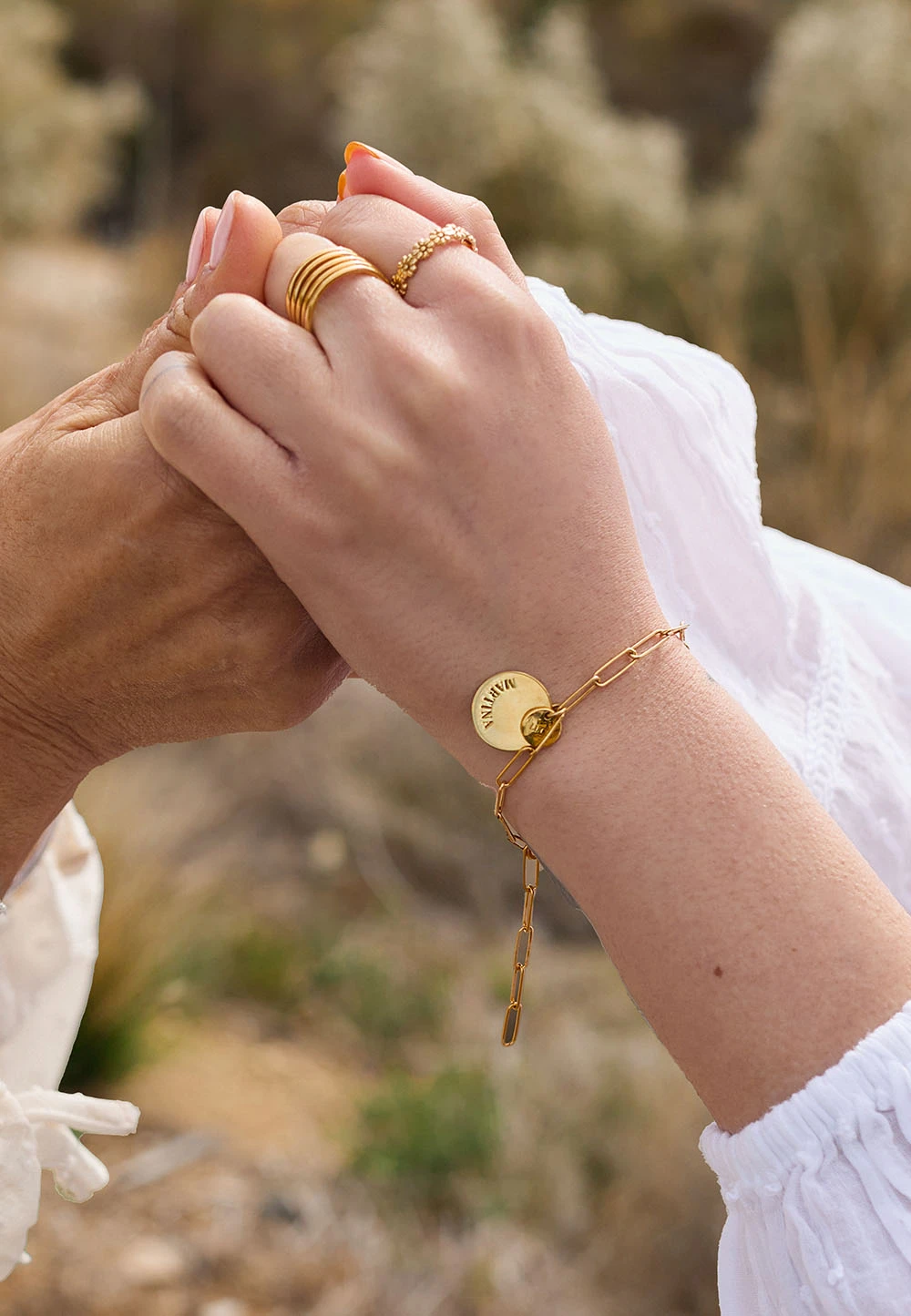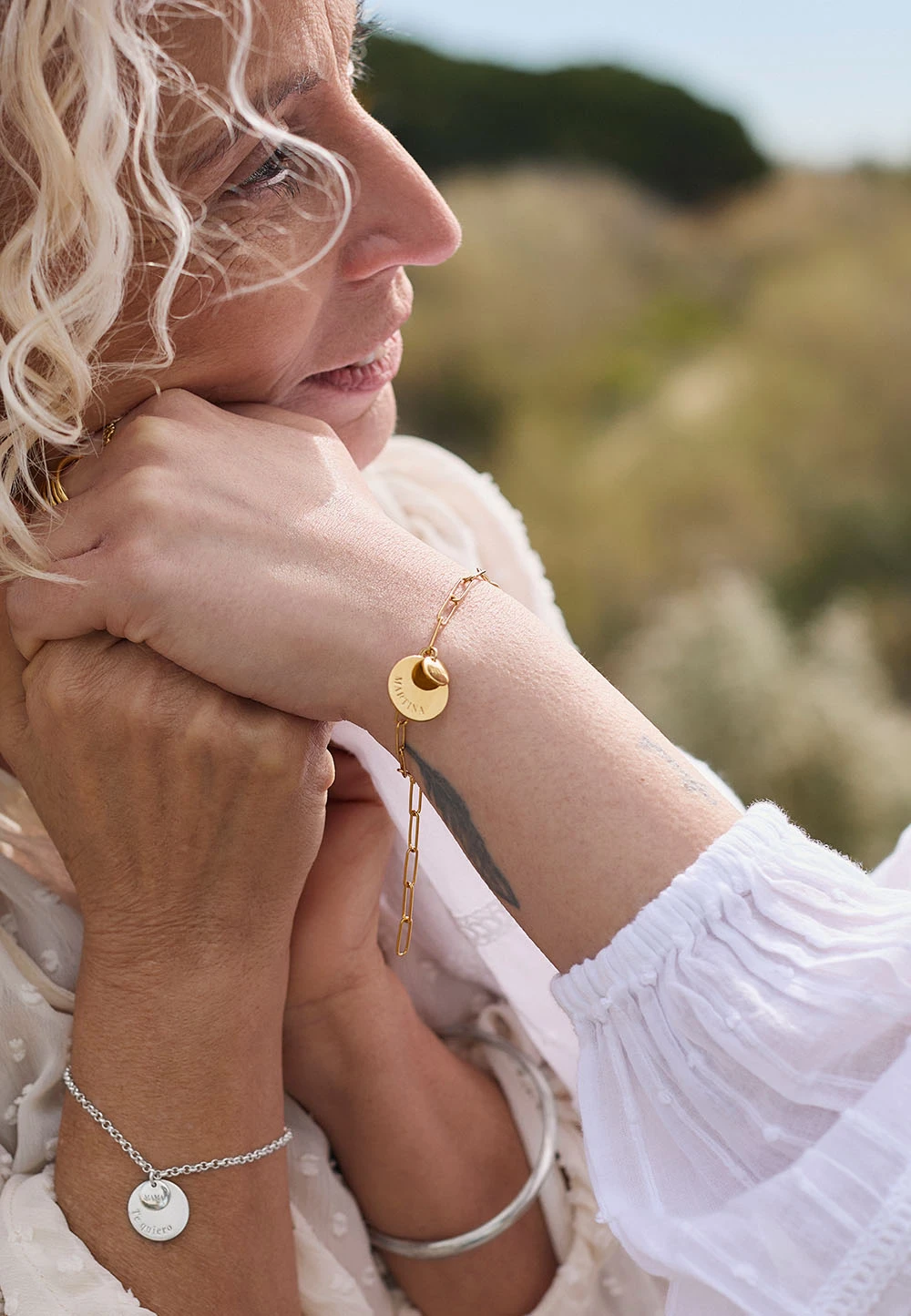 La pulsera Matrika esta hecha de plata de ley 925. Con dos encantadoras chapitas grabables, la pulsera Matrika te brinda la oportunidad de expresarte de una manera única y personal. Ya sea que desees grabar un nombre especial, una fecha importante o una frase inspiradora, esta pulsera es el lienzo perfecto para tus emociones.