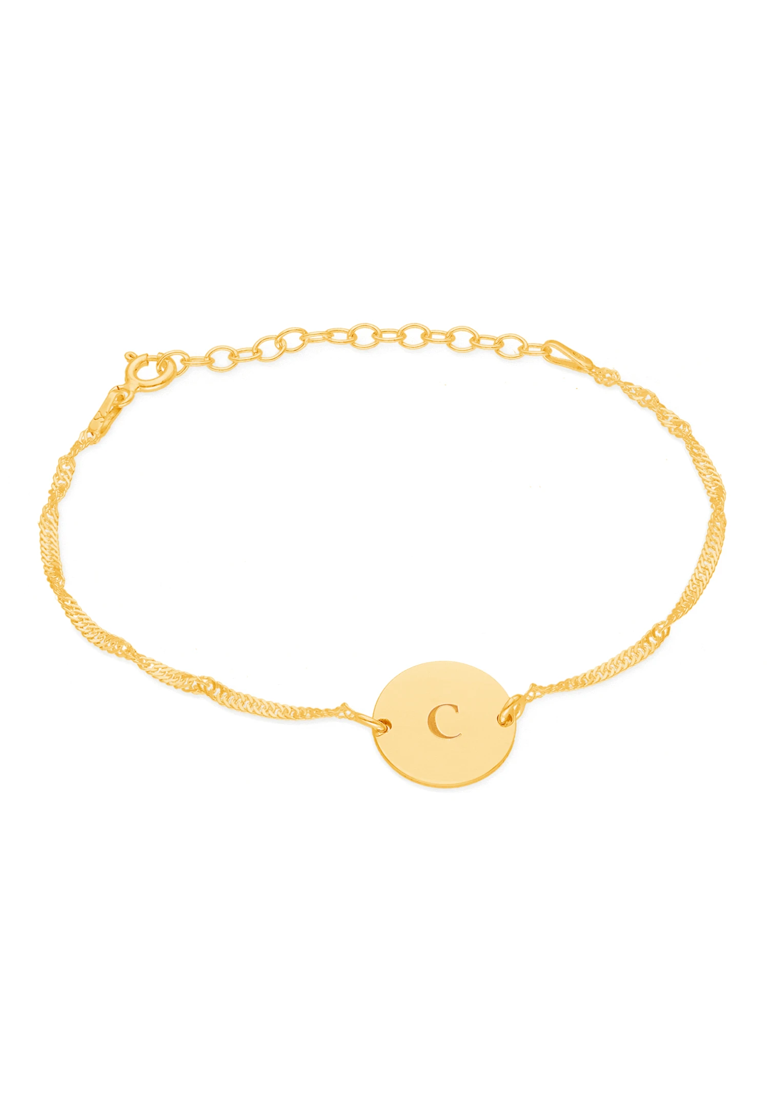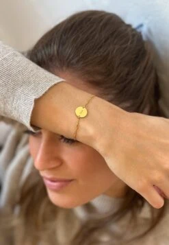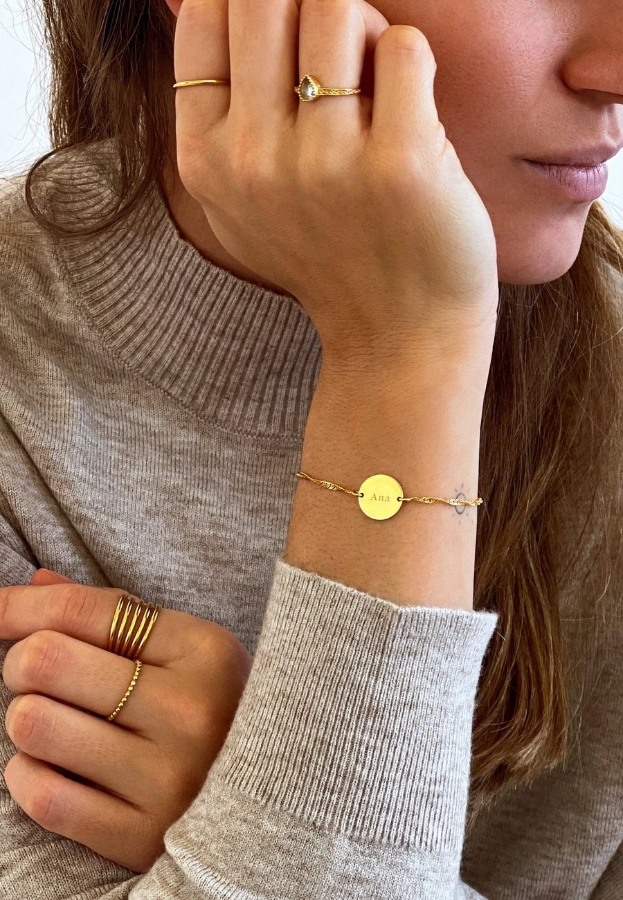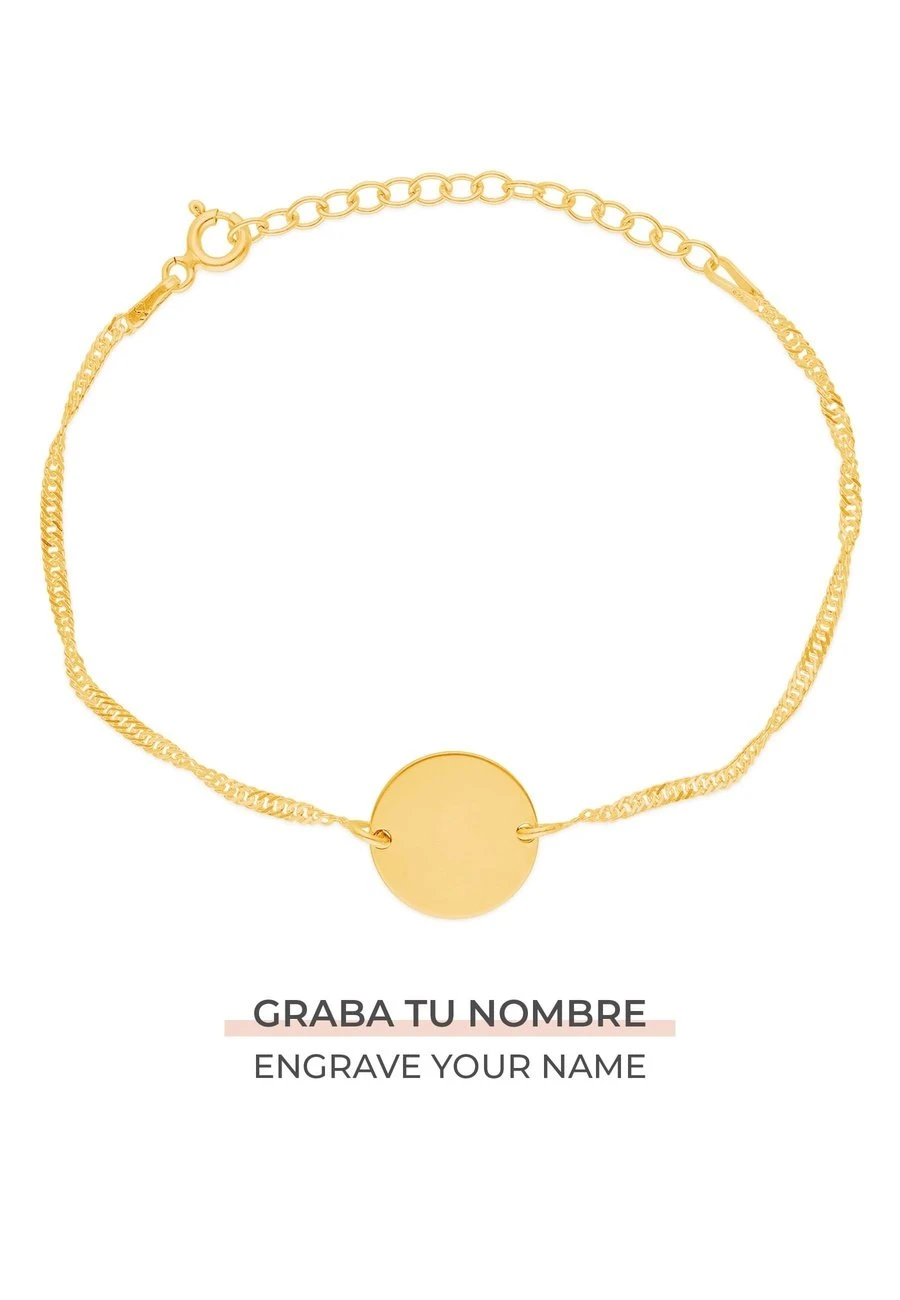 La SHAILA ORO es una pulsera personalizable formada por una cadena tipo “singapur” y una chapa redonda en el centro. ¡Es una joya perfecta para regalar!