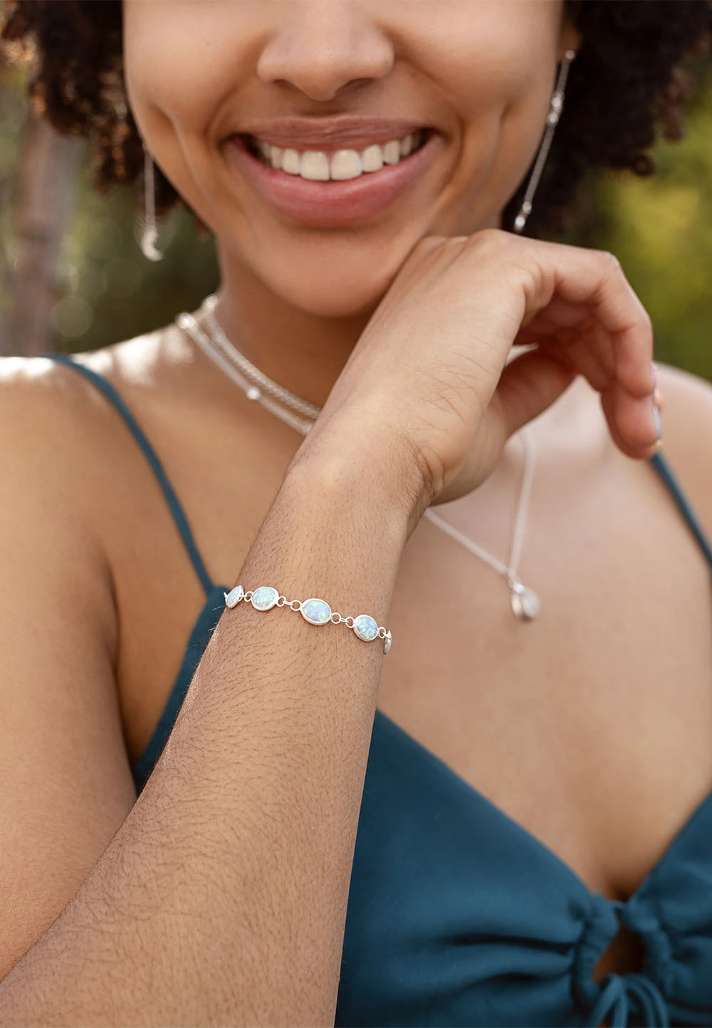 La pulsera SUHANA es una pulsera muy finita formada por una cadenita de eslabón y cinco piedras de ópalo elaborado en forma ovalada.