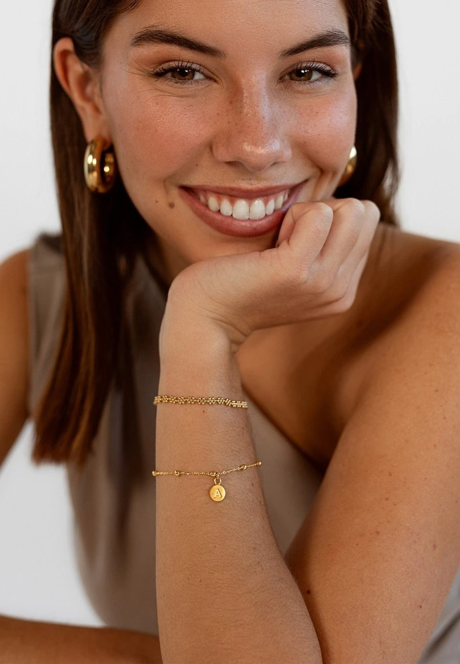 La pulsera TIGAT ORO es una pulsera de Plata de Ley 925 chapada en oro de 22K. La pulsera está compuesta por una fina cadena con bolitas intercaladas. De ella, cuelga la chapa con la inicial que escojas, ¡puedes escoger hasta 4 iniciales!