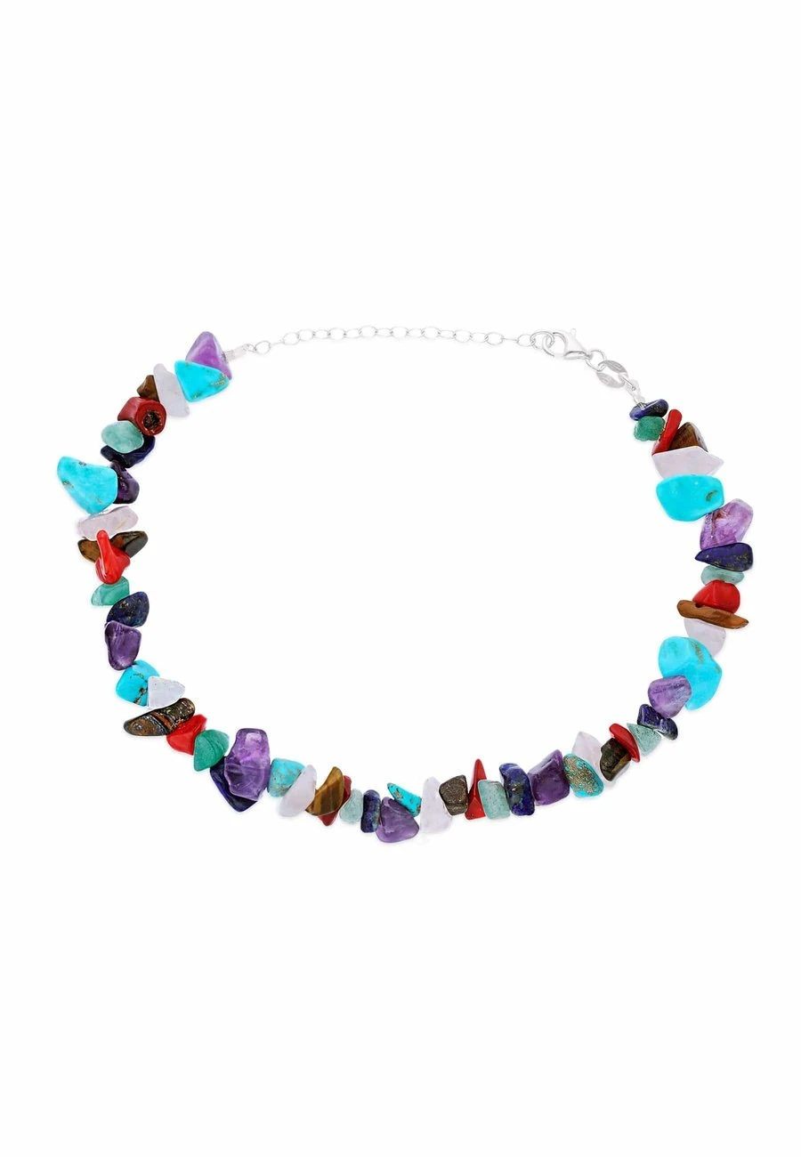 La tobillera ISHARA es una pieza llena de color que está formada por 7 piedras diferentes: Lapislázuli, coral bambú, ojo de tigre, cuarzo rosa, aventurina verde, turquesa y amatista. Cada piedra tiene un color y forma diferente, haciendo que cada joya sea única.