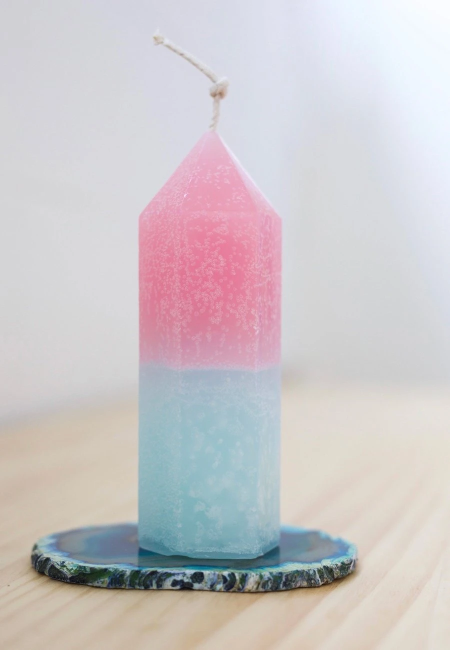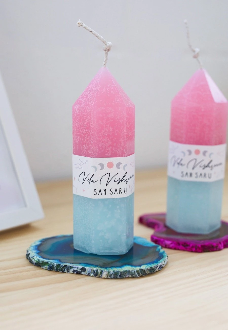 La vela VISHRAAM destaca por tener un diseño de colores pastel, con un degradado de rosa a azul. Está elaborada con parafina de alta calidad y dureza. Su mecha es de algodón natural y celulosa. La mecha viene más larga por si quieres utilizarlas de decoración, para encender la vela, te recomendamos cortar la mecha entre 1cm y 1,5cm (hay un nudo de referencia).